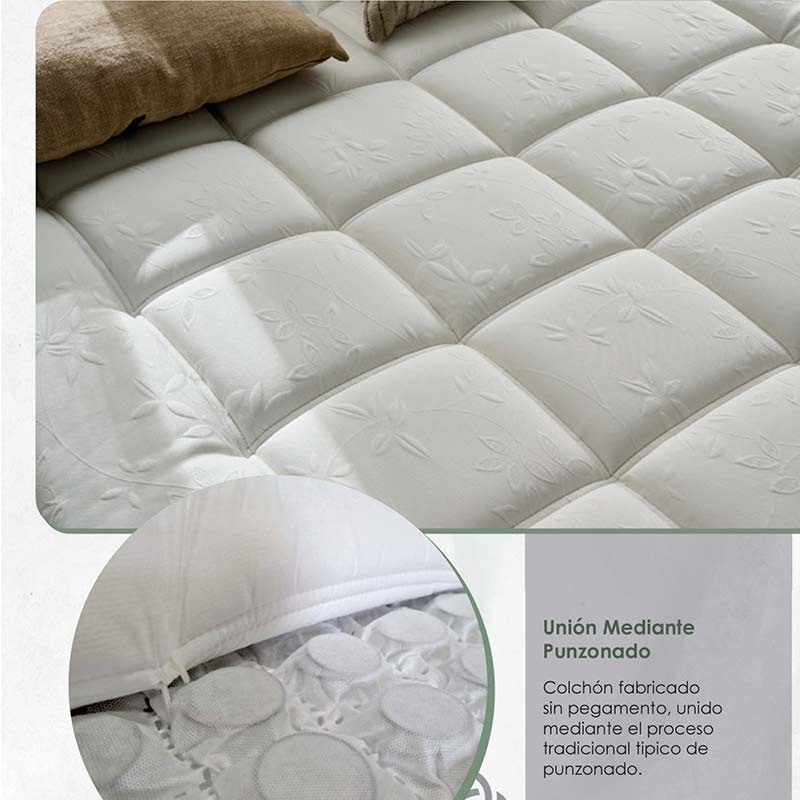 Sistema sin pegamentos: capas unidas mediante punzonado tradicional, eliminando el uso de adhesivos y garantizando un colchón 100% natural y artesanal.